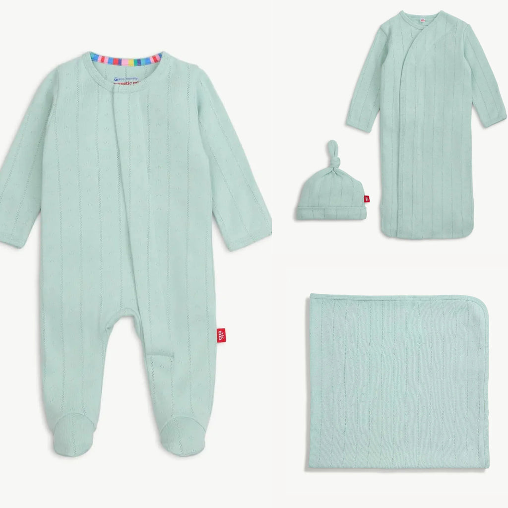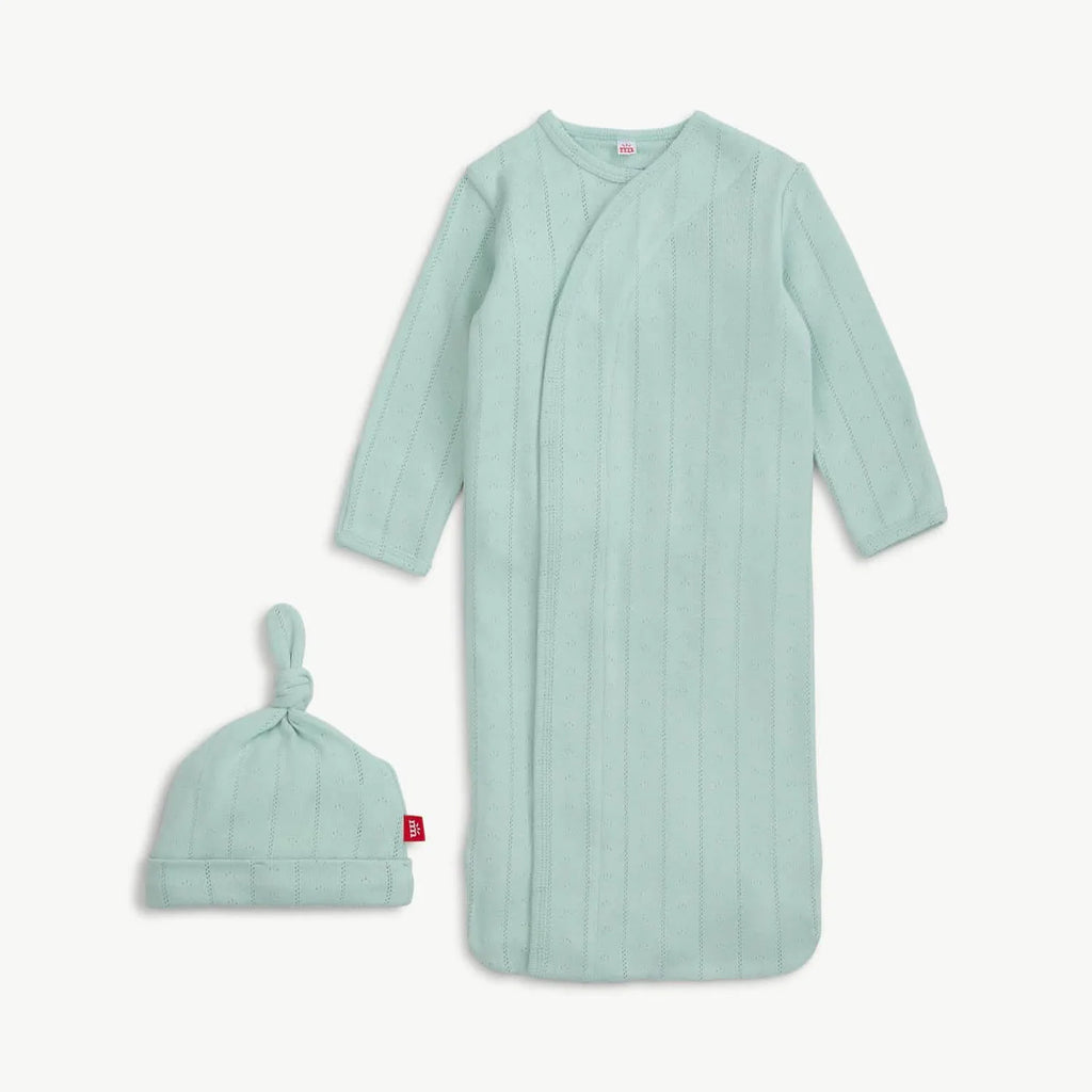 Our organic cotton pointelle Gown & Hat Set is a newborn, late-night must-have. Magnets take diaper changes to a new level of fuss-free efficiency, while a closed bottom keeps toes and feet warm and cozy—which is mission critical during your third middle-of-the-night change. Also worth loving: the built-in mitten cuffs and soft organic cotton with the sweetest pointelle stitching.