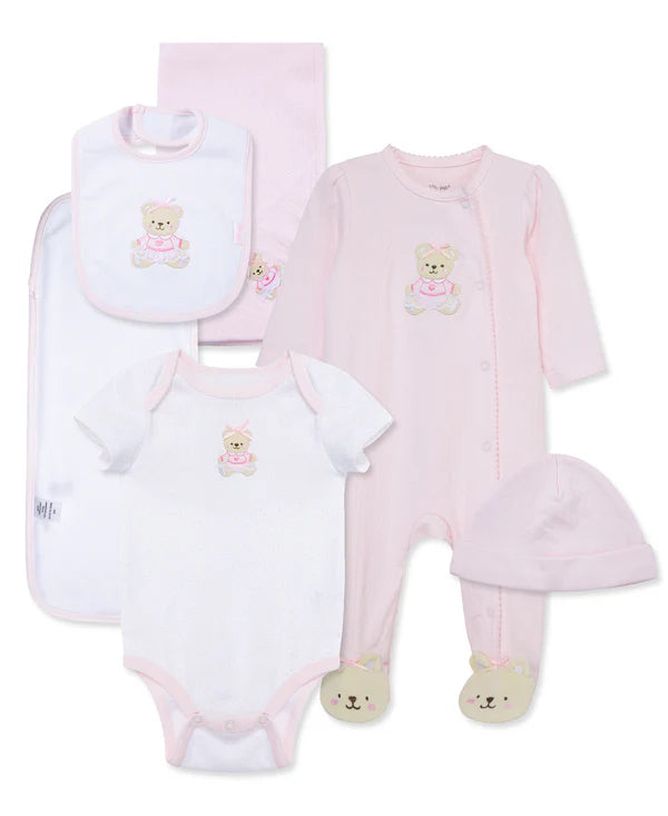 Our Sweet Bear newborn gift set is the perfect gift for that special baby coming into the world! Baby will be comfy and cute in this pink Bear all themed set. The set includes a bear themed footie, hat, bib, burp cloth, bodysuit, and blanket, all included in a cute gift box.