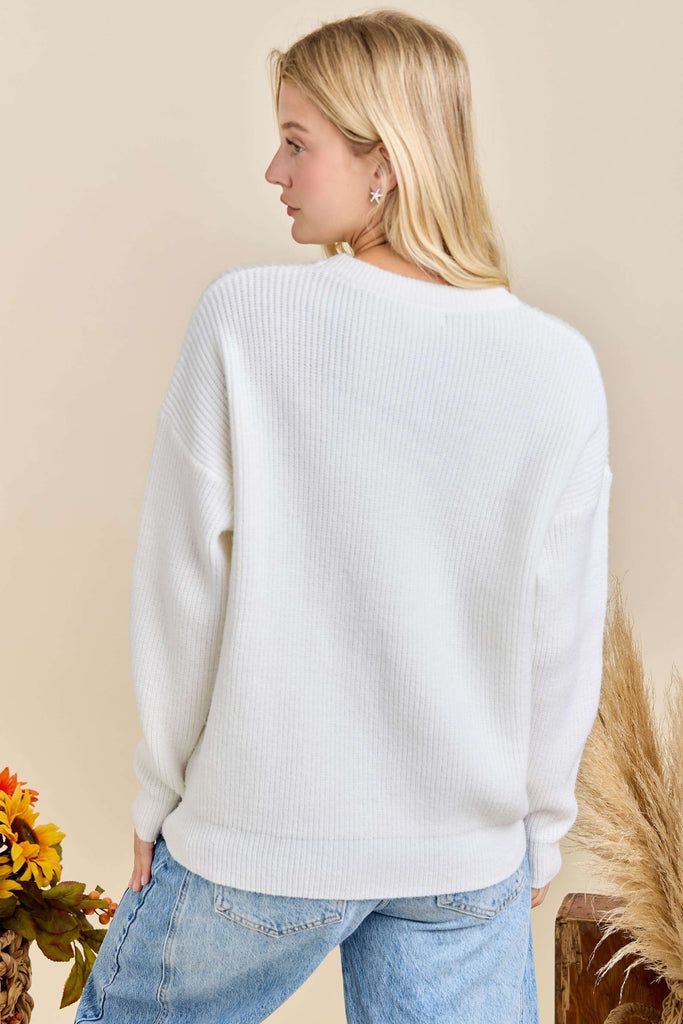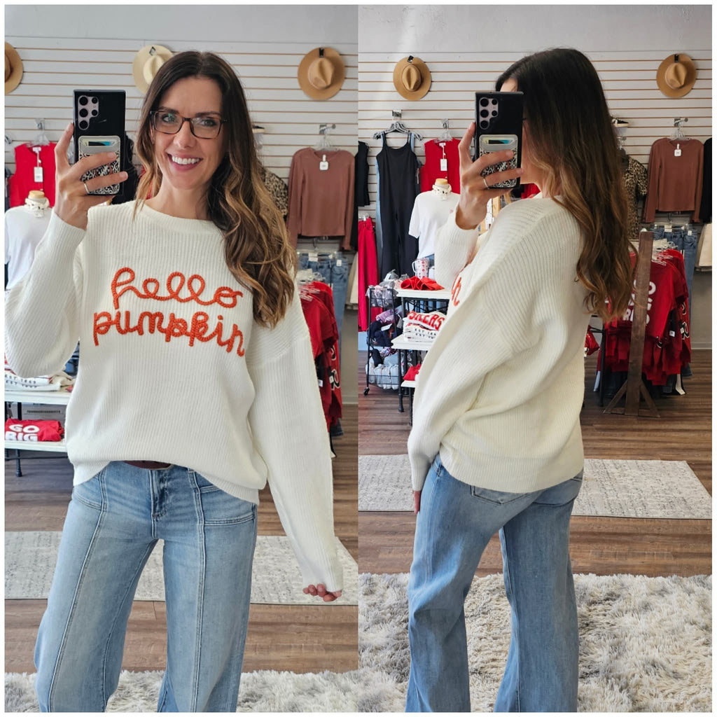 Add a touch of cozy charm to your fall wardrobe with our new Hello Pumpkin embroidered knit sweater. Crafted in a soft and lightweight kinit, this pullover is perfect for pumpkin patch visits, Thanksgiving gatherings, and everyday autumn outings. The playful white embroidery adds a seasonal statement while the relaxed fit makes it comfortable for all-day wear.Â