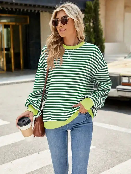 Effortless style meets comfort in this relaxed striped crew neck sweater. Featuring classic horizontal stripes and a laid-back fit, it's perfect for casual days when you want to look put-together without trying too hard. The crew neckline and soft fabric make it an easy go-to piece that pairs well with jeans, skirts, or trousers. A timeless wardrobe essential that works season after season.