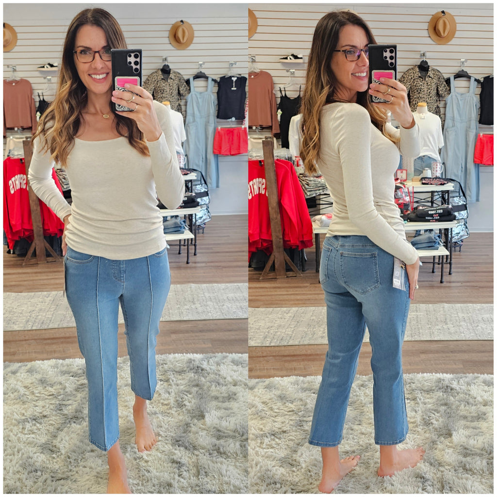 These solid denim crop jeans combine classic style with a modern twist. Featuring a pintuck detail and a kick flare leg, they offer a fresh take on a timeless silhouette. With real front and back pockets for added practicality, and made from a soft cotton-spandex blend, these jeans provide the perfect balance of comfort and stretch for a flattering fit.