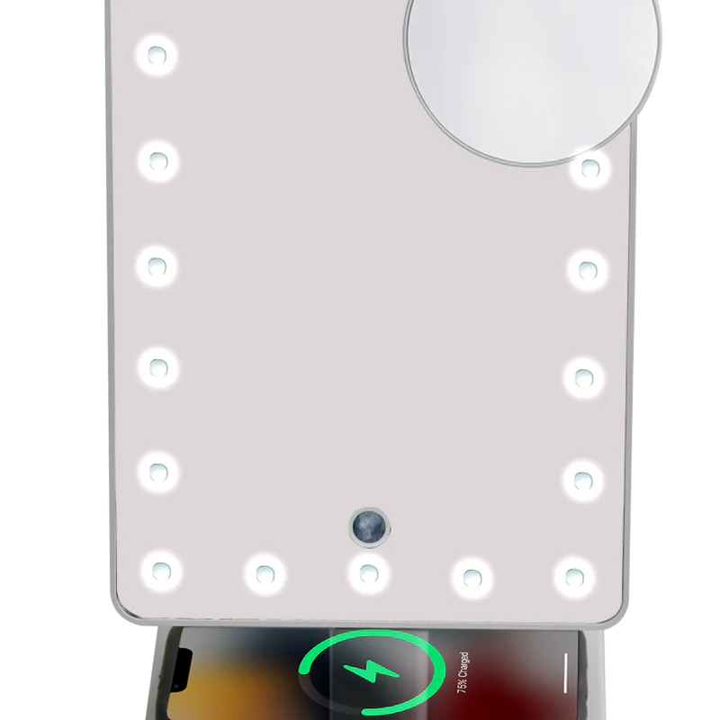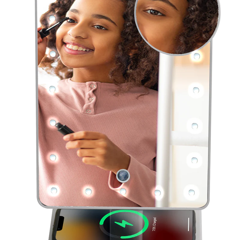 New from Trend Tech Brands our Glam Studio Vanity Mirror and Bluetooth Speaker in white. This travel size mirror is perfect for Bedrooms, Dorm Rooms and MORE! Complete with hands free calling, a wireless charger and a phone holder to bring your glam sessions to the NEXT level.