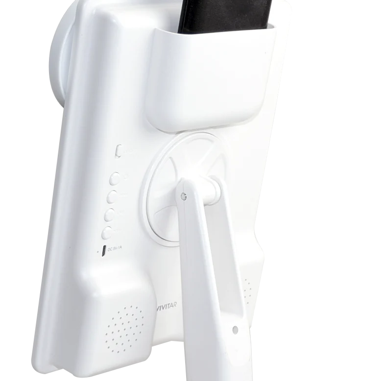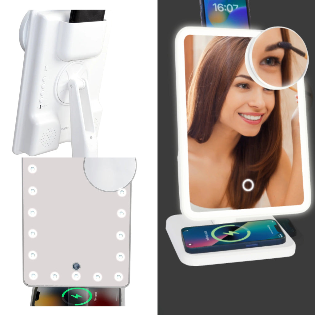 Mirror with Bluetooth Speaker, Magnfier, Phone holder, Built in Microphone and Wireless Charger - White