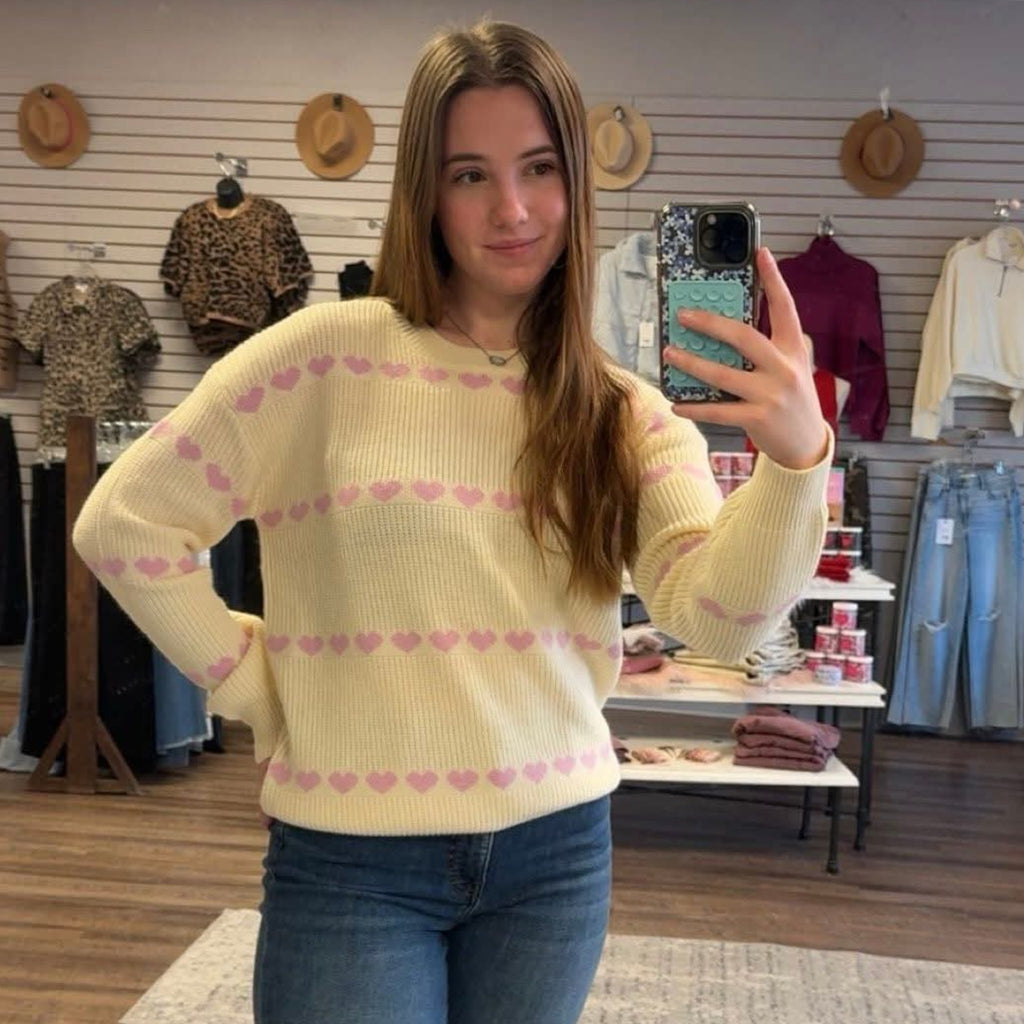 Wrap yourself in cozy charm with this delightful cream and pink heart knit sweater! Perfect for spreading love and warmth, this playful piece features adorable heart details that add a touch of whimsy to any outfit. The soft knit fabric keeps you comfortable all day long, whether you're lounging at home or out and about. Layer it over your favorite tee or wear it solo for an instant mood boost. A sweet staple that celebrates the joy in everyday style!