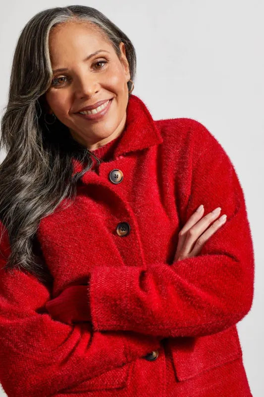 The Tribal button-up jacket captivates with its casual, stylish design. Featuring a classic shirt collar neckline, relaxed fit, long cuffed sleeves, fully lined interior, front pockets, and faux horn buttons, it balances functionality and fashion. Made from super-soft boucle eyelash fabric, it adds a unique textural interest to any ensemble. Perfect for versatile layering, this jacket seamlessly blends comfort and trendy appeal for various occasions.